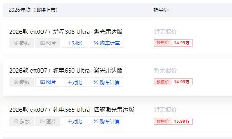 eπ007+共推出三款配置,预售价格如下:增程308 Ultra+激光雷达版14.99万元;纯电650 Ultra+激光雷达版 14.99万元;纯电565 Ultra+四驱激光雷达版15.99万元。预售期间,用户可享受多项权益,包括99元抵10000商城积分、限时免费外观色、跨年购置 税补贴等,进一步提升了车辆的性价比。从定位来看,eπ007+瞄准的是15万级中高端纯电/增程轿跑市场。其竞争对手包括小鹏P5、比亚迪海豹等车型,而eπ007+在智能硬件、动力配置与设计细节上具备一定差异化优势。